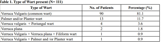Materials and Methods: All the patients presenting to the Out-patient Department of Dermatology and willing to participate for the treatment of warts and not falling under the exclusion criteria were included as study cases. Each of them were given the injection into the largest lesion every fortnightly for total 3 injections. Length, breadth, number of lesions and any local changes at the site of injection were recorded in each visit.