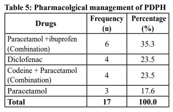 Result: Of the total 261 patients, there were 28 (10.8%) cases with postdural puncture headache. Patients were managed by both conservative and pharmacological methods. Commonly used analgesics were combination of paracetamol and ibuprofen in 6(35.3%) patients. Conservative management included bed rest, supine positioning, adequate hydration and intake of coffee.