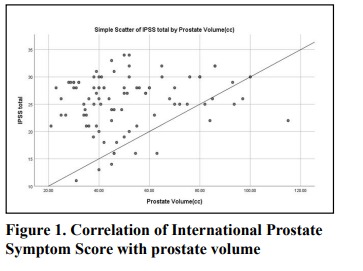Conclusion: In the present study, prostate volume and lower urinary tract symptoms severity showed mild correlation suggesting that larger prostate volumes do not necessarily mean more severe symptoms. Hence International Prostate Symptom Score can be a better tool for assessing patients with lower urinary tract symptoms due to Benign Prostatic Hypertrophy and planning further treatment.